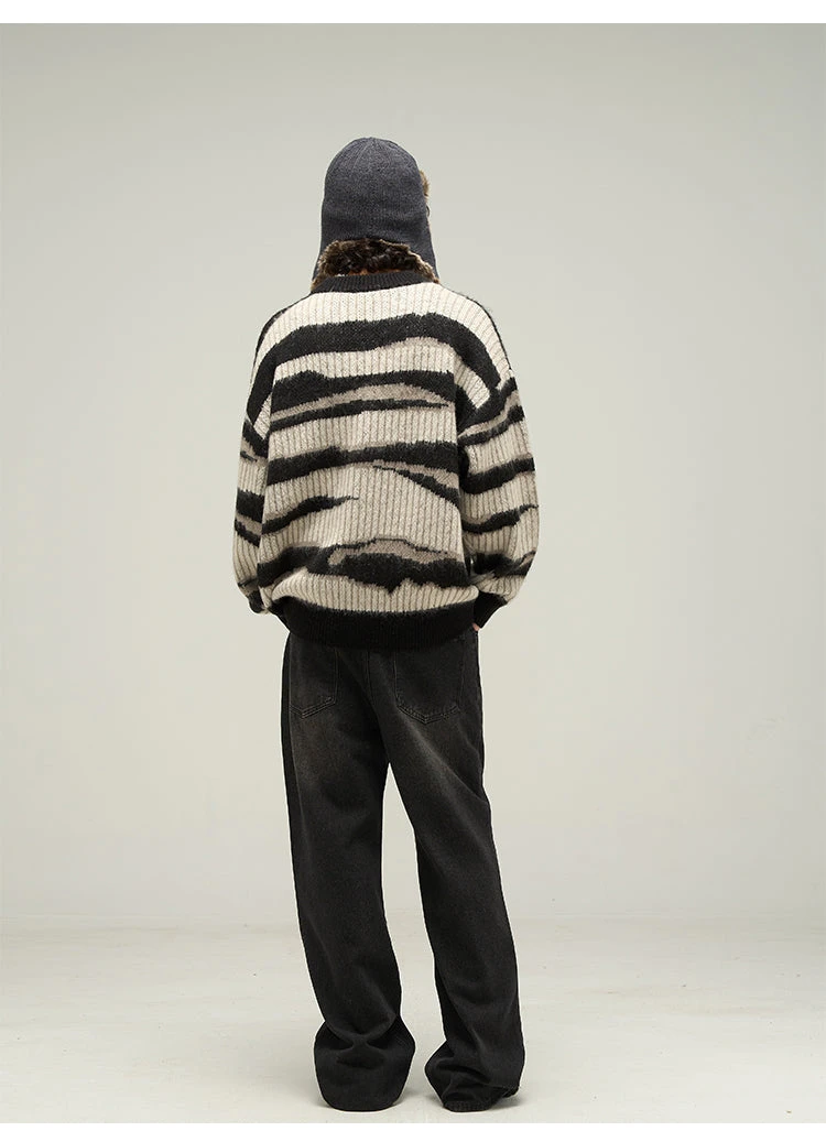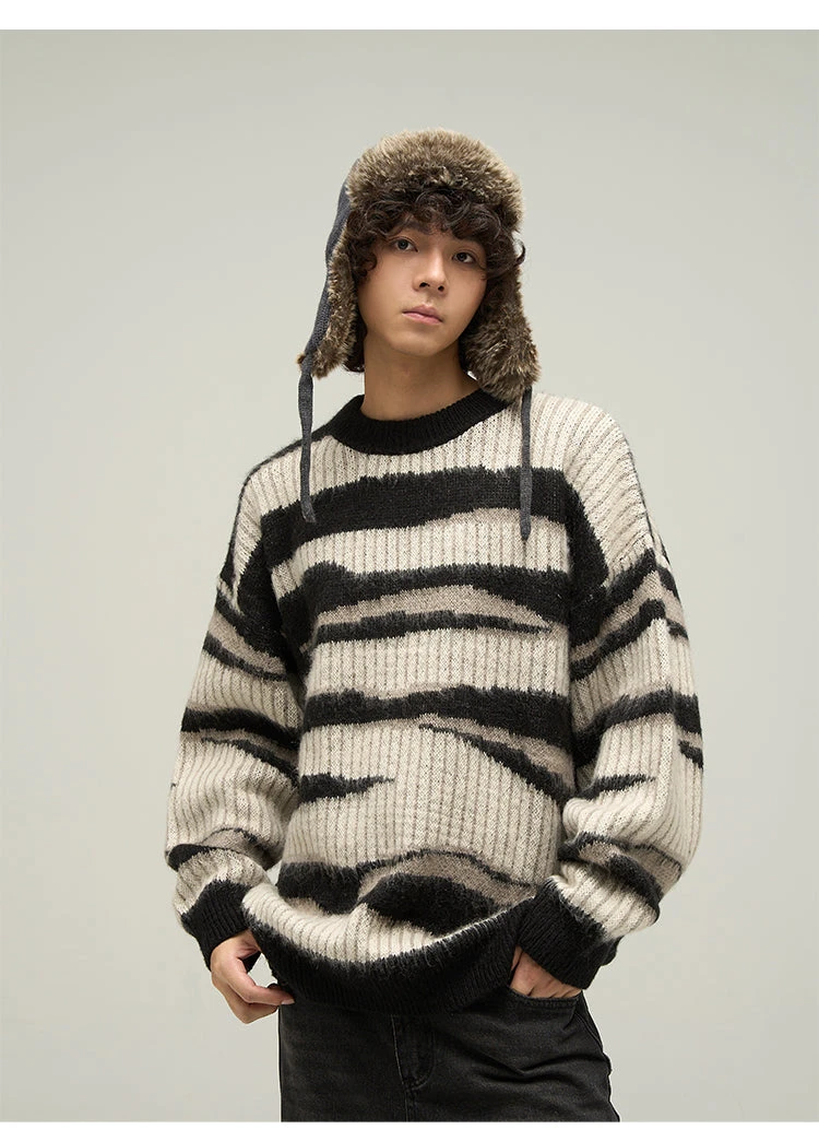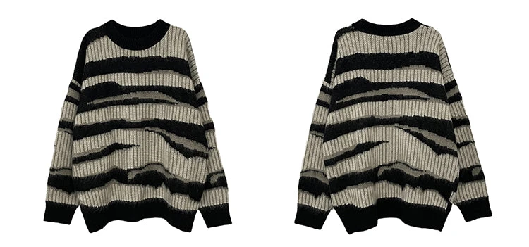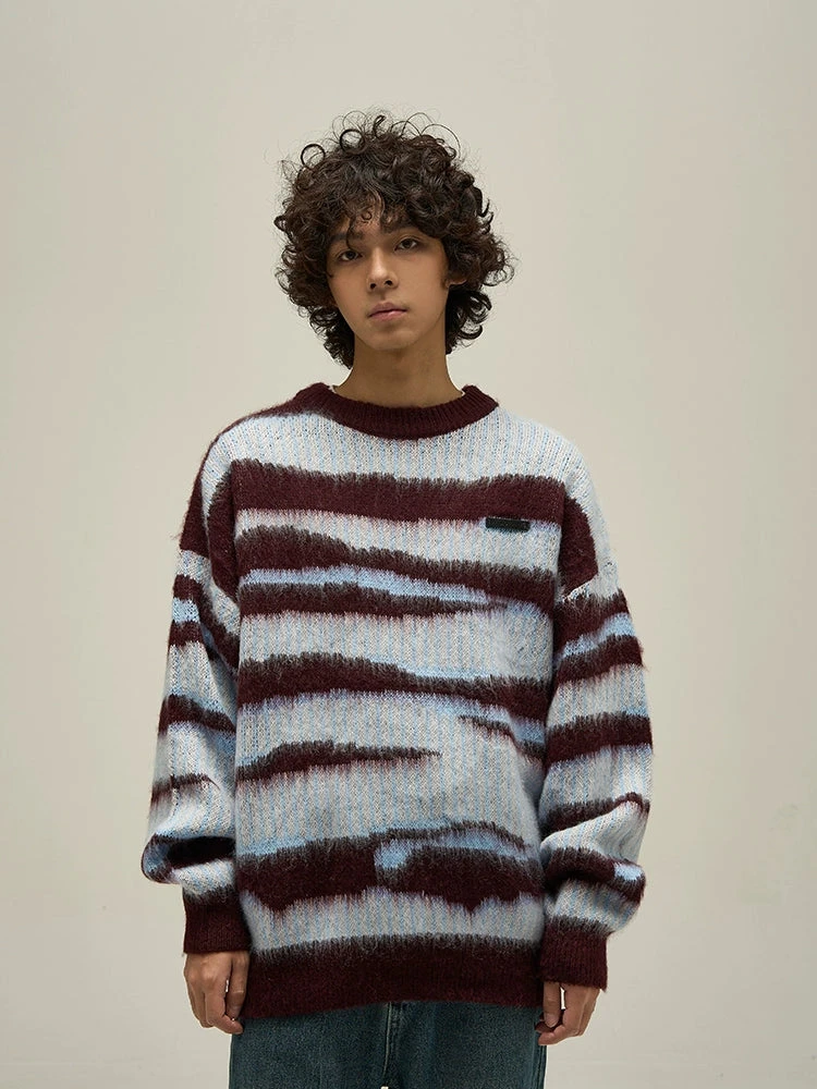 WLNEXT knit wool-blend sweater, vertical and horizontal striped pattern throughout, rib knit crewneck/hem/cuffs, dropped shoulders, logo patch at chest.
