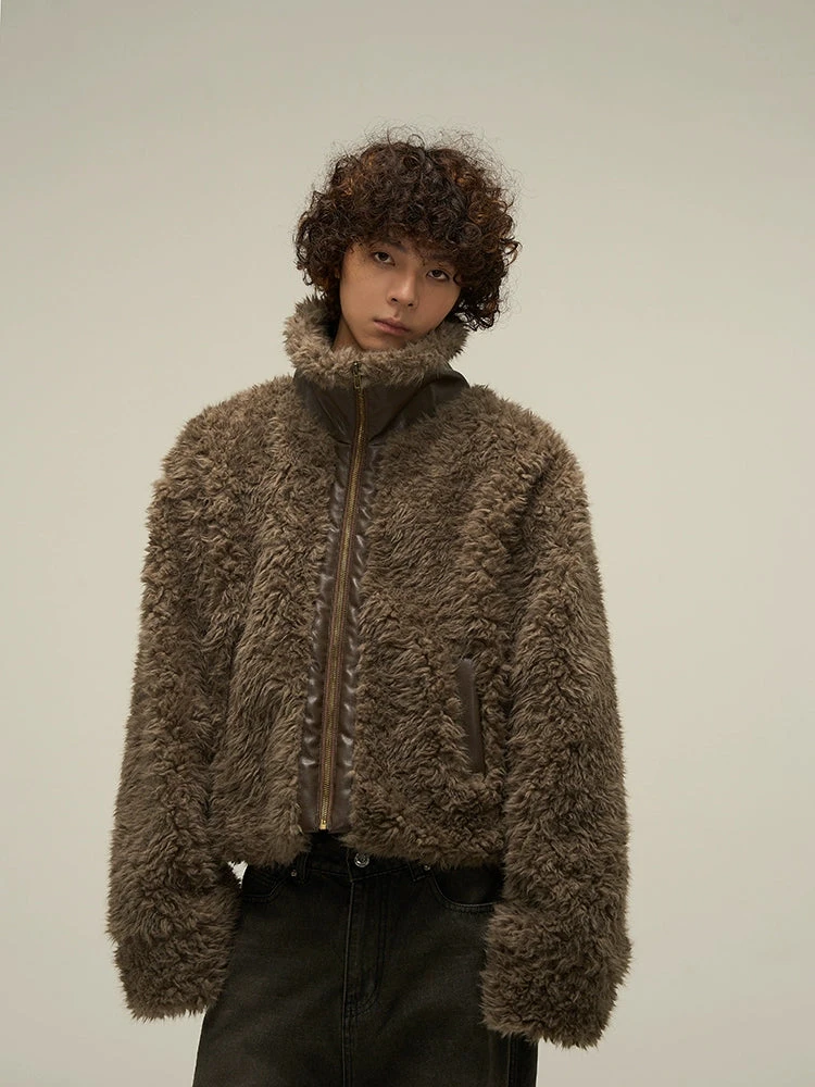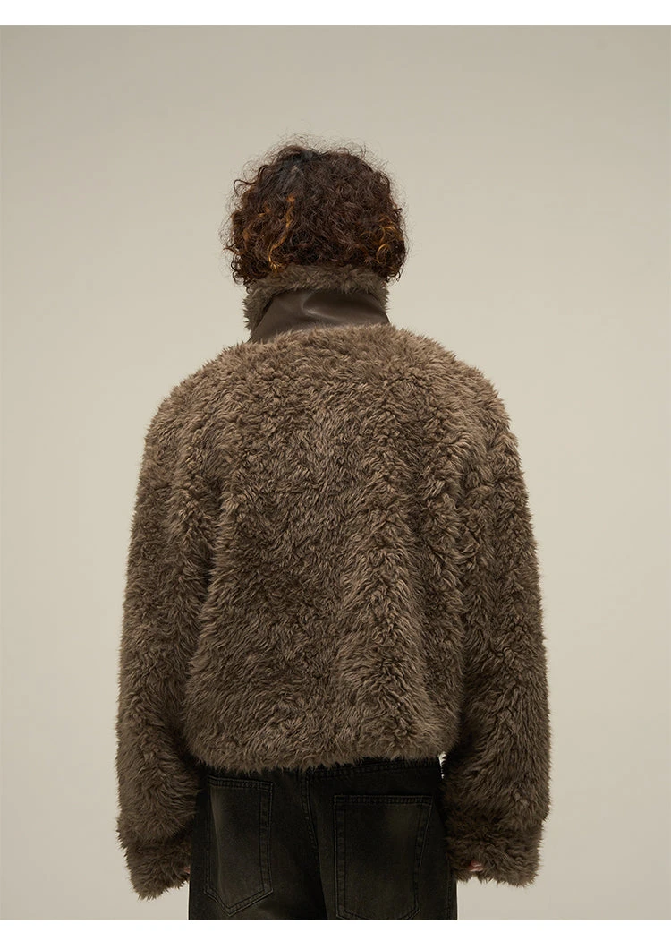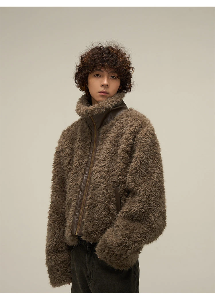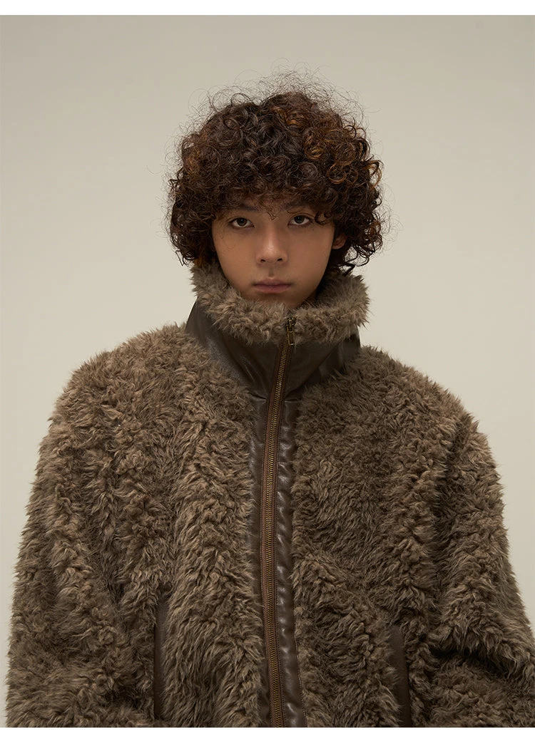WLNEXT sherpa fleece jacket, faux leather trim throughout, stand collar, zip closure, welt pockets, gold-tone hardware.