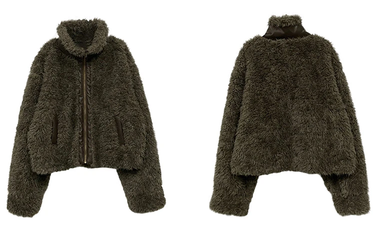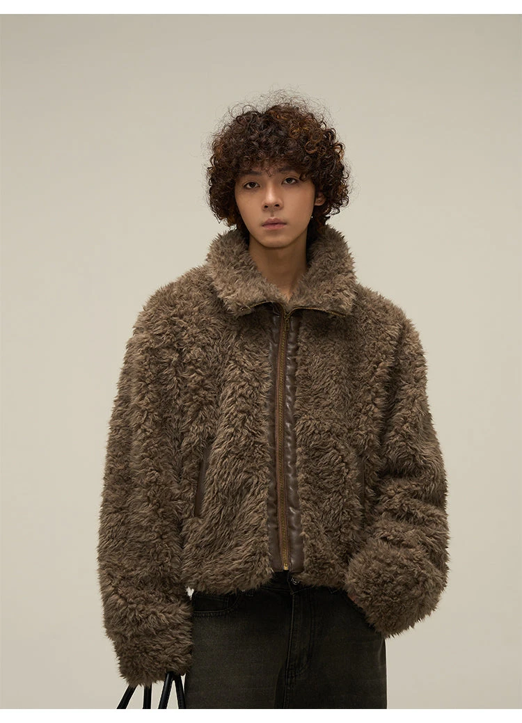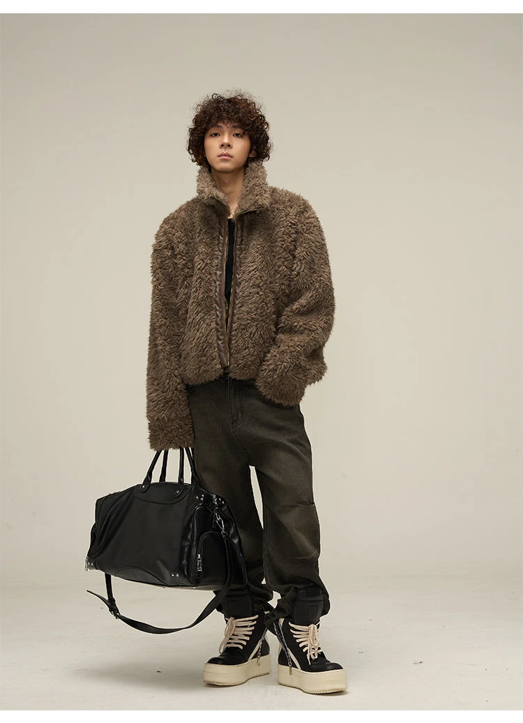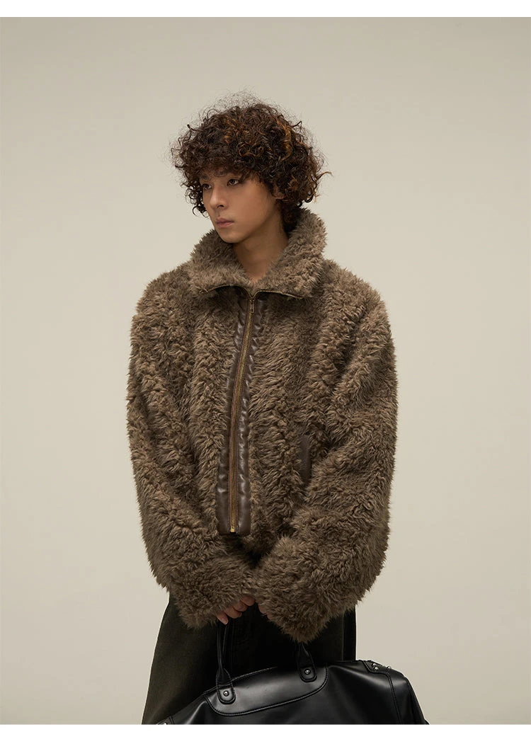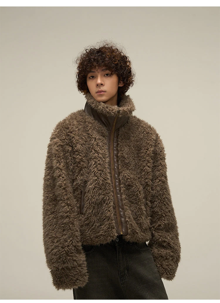 WLNEXT sherpa fleece jacket, faux leather trim throughout, stand collar, zip closure, welt pockets, gold-tone hardware.