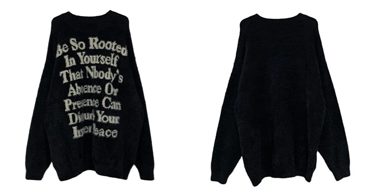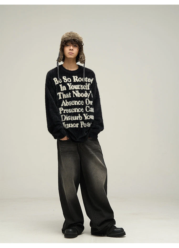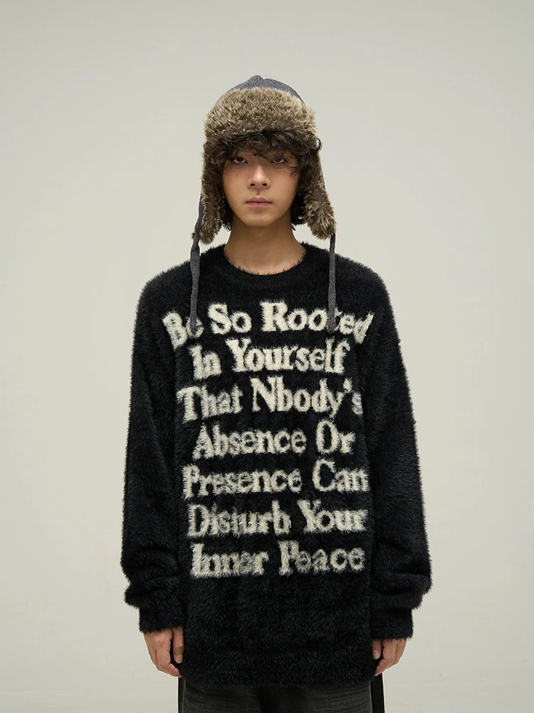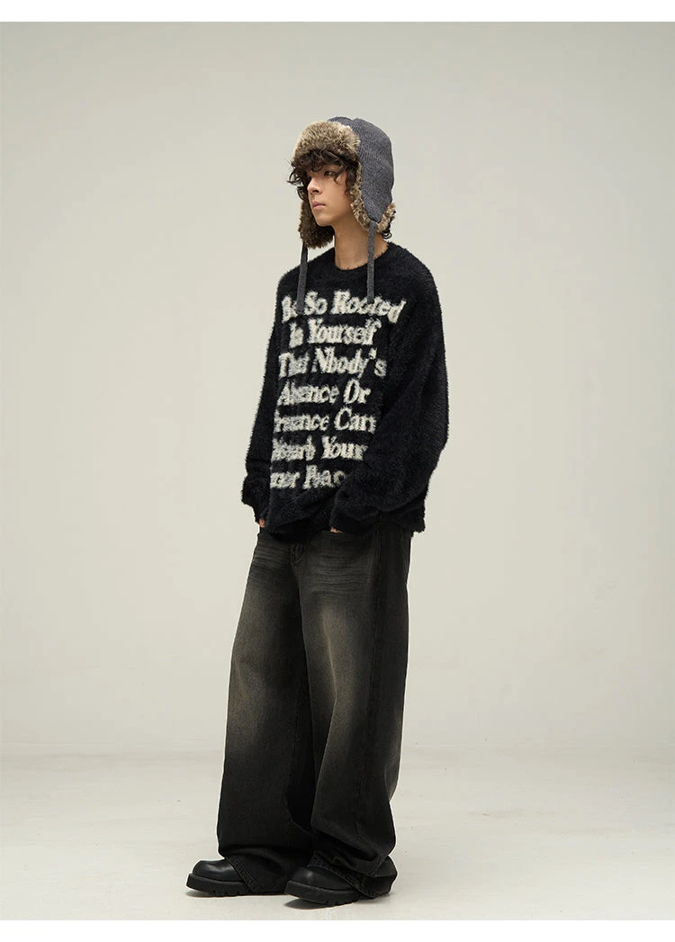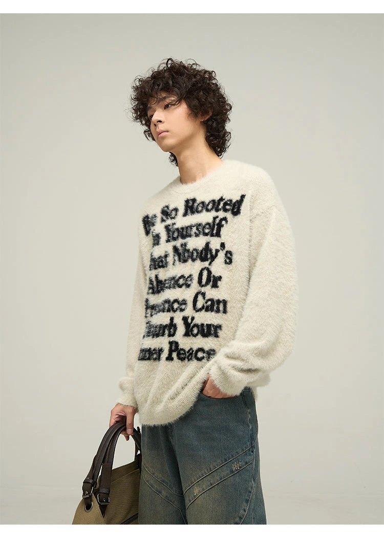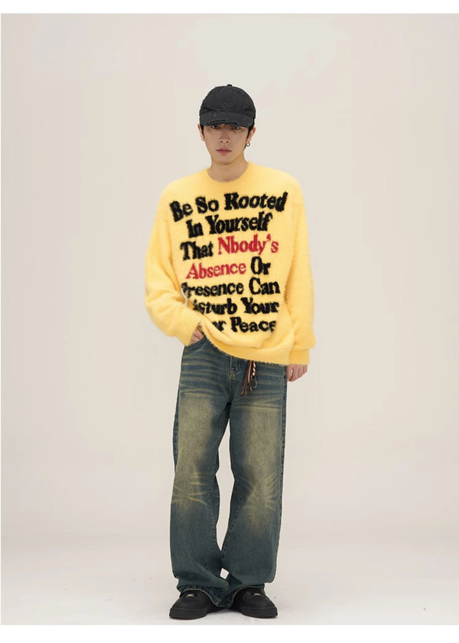 WLNEXT knit wool-blend sweater, rib crewneck/cuffs/hem, text at front.