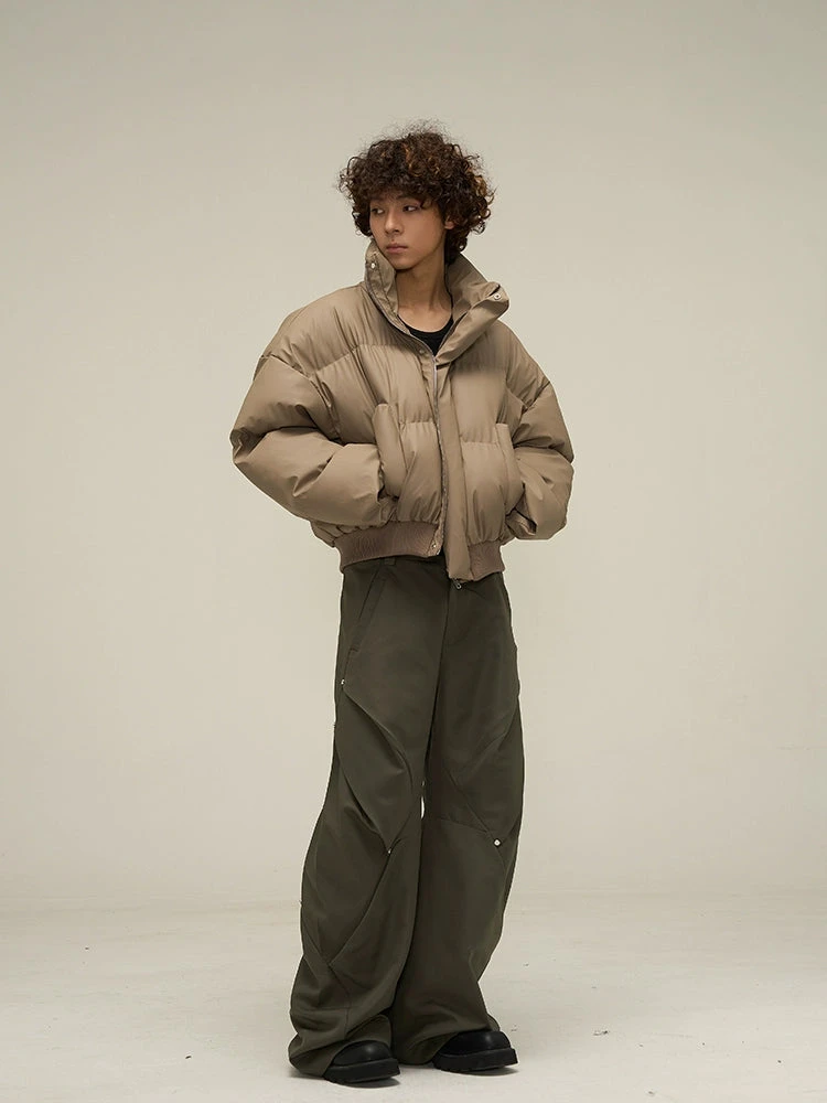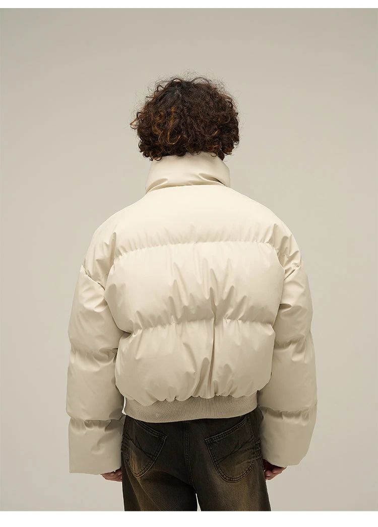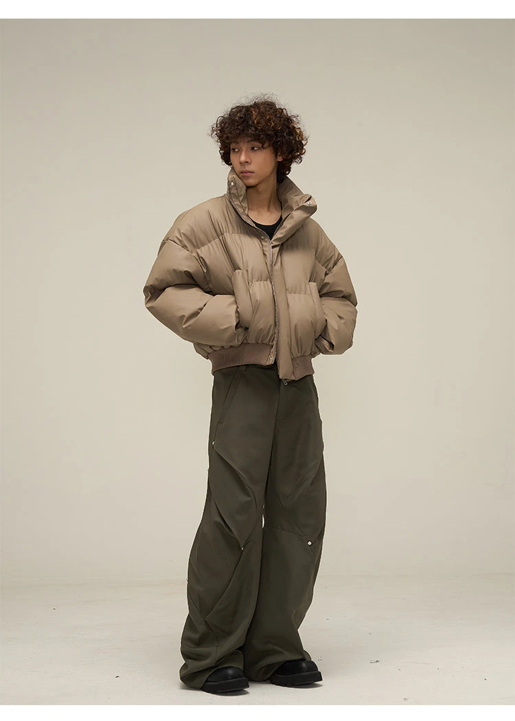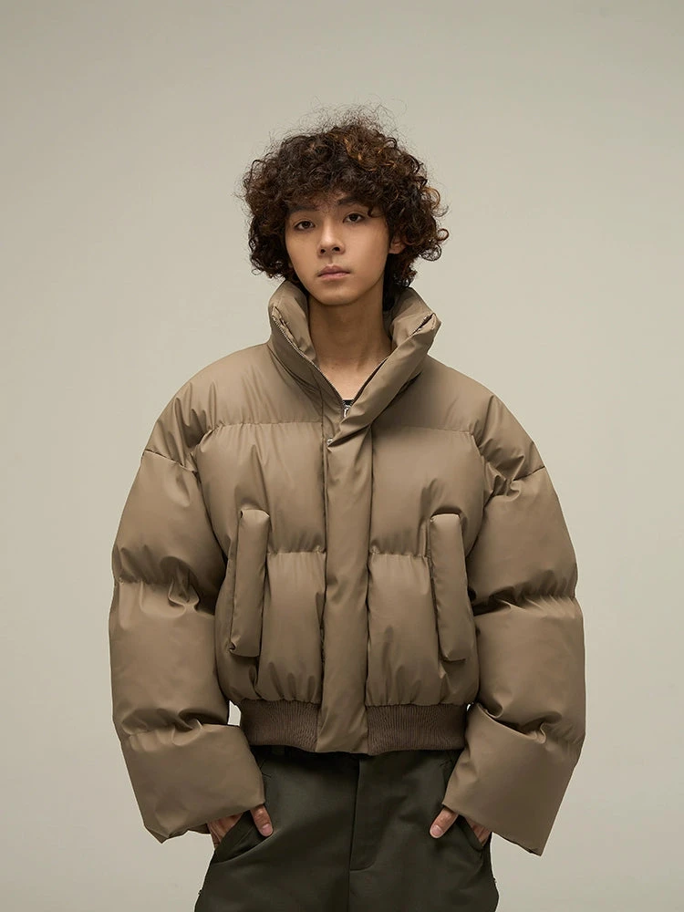 Down-filled quilted polyester-blend jacket, rib knit hem, inset rib knit cuffs, summary closure at stand collar, zip closure at interior, welt pockets, lined.