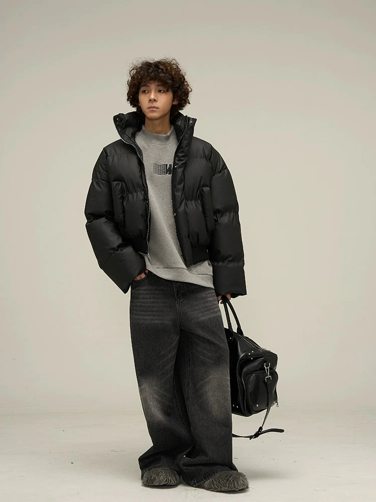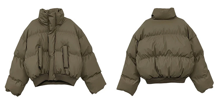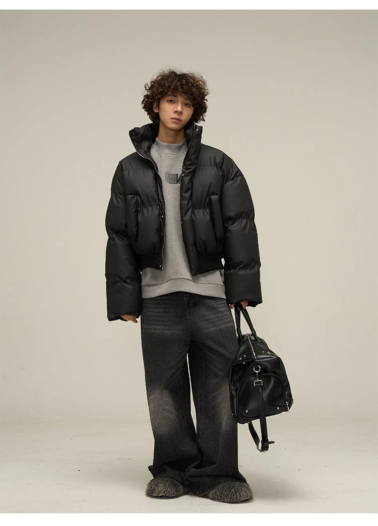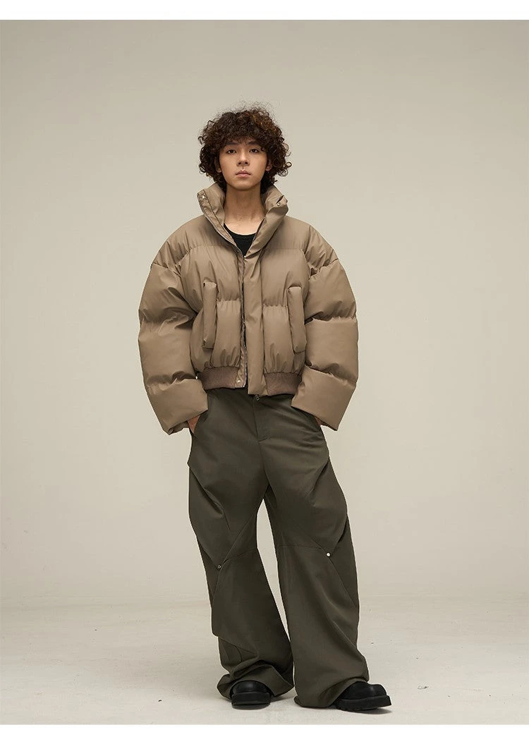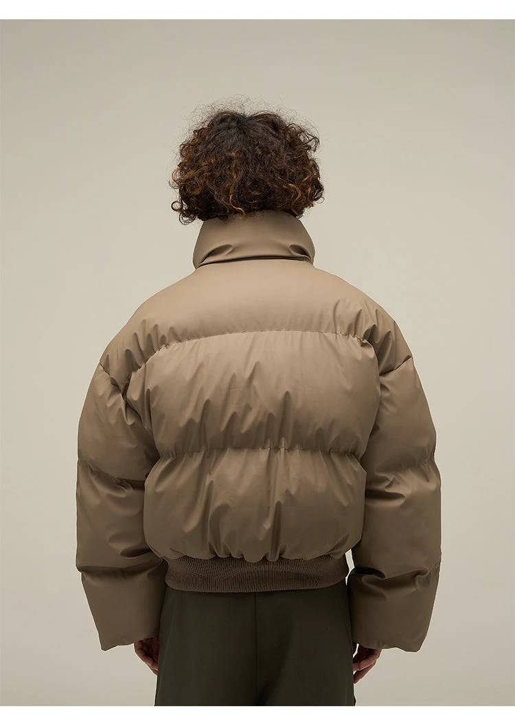 Down-filled quilted polyester-blend jacket, rib knit hem, inset rib knit cuffs, summary closure at stand collar, zip closure at interior, welt pockets, lined.
