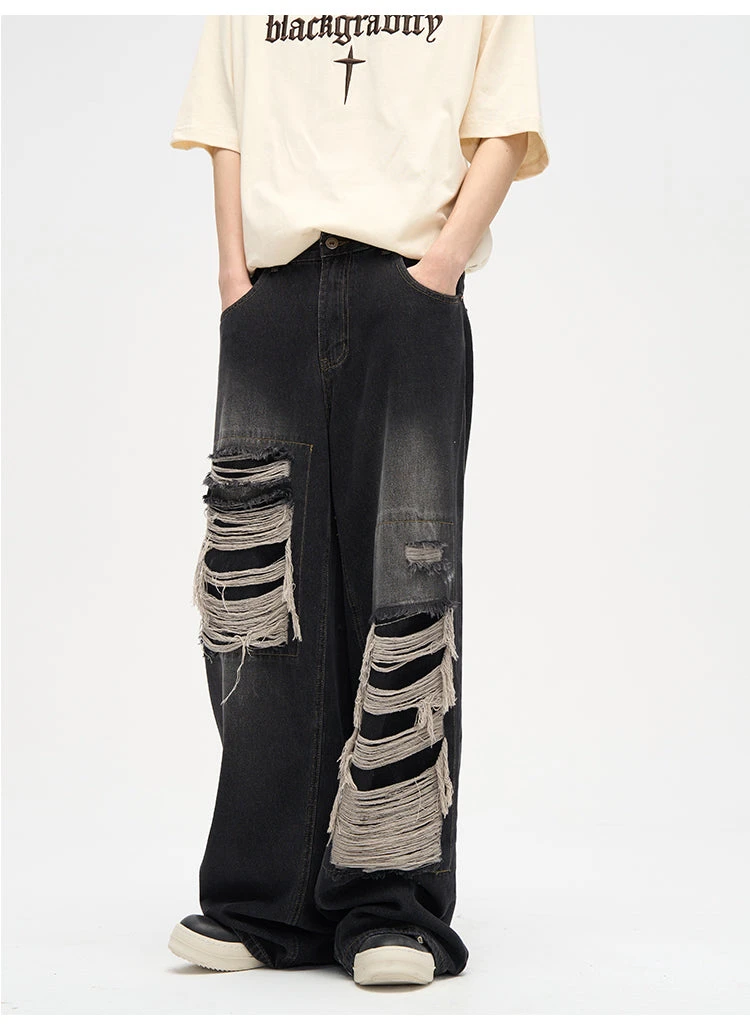 WLNEXT denim jeans, distressing and fading throughout, belt loops, zip-fly, four-pocket styling, laddering at front.